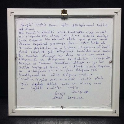 Korkmaz ailesi, Emel annenin notunu yazdığı fotoğrafı çerçeveletip Ali İsmail’in adını taşıyan yeğeni Ali Yusuf’un giydiği Düşlerinde Özgür Dünya tişörtü ve Ali İsmail’in el yazısıyla tuttuğu notlarıyla birlikte Mahir’e yolladı.
