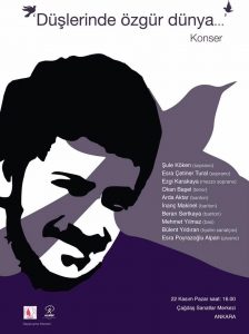 Ankaralı sanatçılar 22 Kasım’da Ankara Çağdaş Sanatlar Merkezi’nde düzenlenecek olan ‘Düşlerinde Özgür Dünya’ konserinde şarkı ve şiirlerini Ali İsmail Korkmaz için seslendirecek.