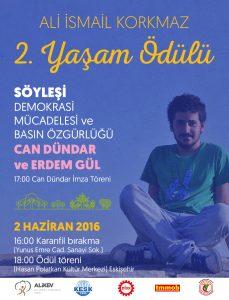 Ali İsmail Korkmaz Vakfı, Eskişehir Tabip Odası, TMMOB İKK, DİSK Bölge Temsilciliği ve KESK Eskişehir Şubeler Platformu tarafından bu yıl ikincisi düzenlenecek olan Ali İsmail Korkmaz Yaşam Ödülü’nün Cumhuriyet Gazetesi Genel Yayın Yönetmeni Can Dündar ve Cumhuriyet Gazetesi Ankara Temsilcisi Erdem Gül’e verilmesine karar verildi.