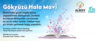 ALİKEV Düş Elçileri’nin hazırladığı “Gökyüzü Hala Mavi” projesi kapsamında 13 Eylül akşamı unutulmaz bir konsere imza atılıyor. ALİKEV Müzik Topluluğu’nun vereceği konserin yanı sıra Tanya Taş’ın piyano resitali ve dans gösterileri de konuklara muhteşem bir akşam yaşatacak. Ücretsiz konserde dinleyiciler roman, şiir ve hikâye kitabı bağışı yaparak Hatay’daki kütüphanelere ve okullara katkıda bulunacak.