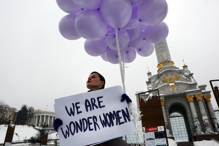 Ukrayna, Kiev’ de ise feminist ve LGBTQ+ aktivistler cinsiyetçiliğe, ataerkiye ve kadın haklarının ihlaline karşı savaş koşullarına rağmen protesto düzenledi.